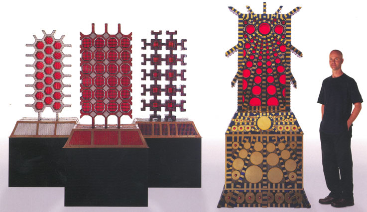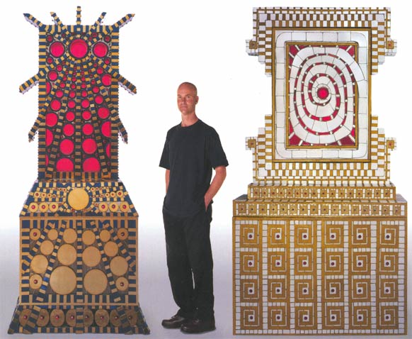 Each sculpture has glazed ceramic tile and red-orange stained glass, both of which add elements of color and quality. The two larger sculptures that you see above weigh at least a ton each and are priced at $100,000.